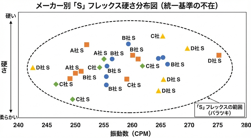 これは、あるメーカーが設定した「S」という基準が、他社の「S」と同等であることを保証するものではないことを意味します。実際に複数のメーカーのシャフトを同一条件下で剛性計測したデータにおいては、「A社のSフレックスが、B社のXフレックスよりも剛性が低い(柔らかい)」という逆転現象も珍しくありません。