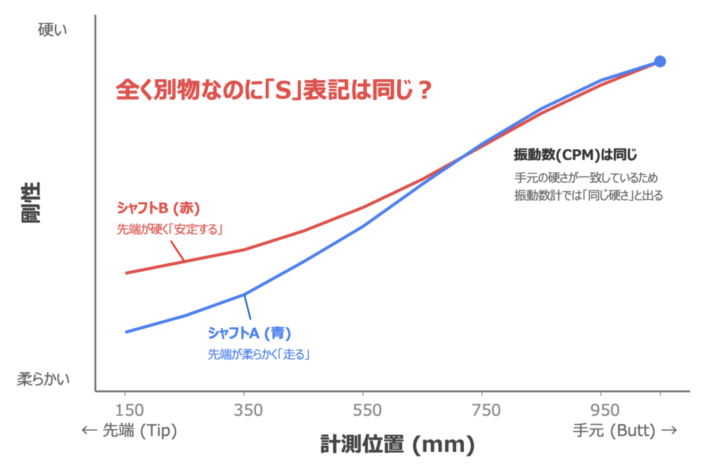 [ここに図解:同じ振動数(CPM)を持つ2本のシャフトの剛性分布図。CPMは同じでも、グラフの波形(先端と手元の硬さ)が全く異なる様子を示す図]